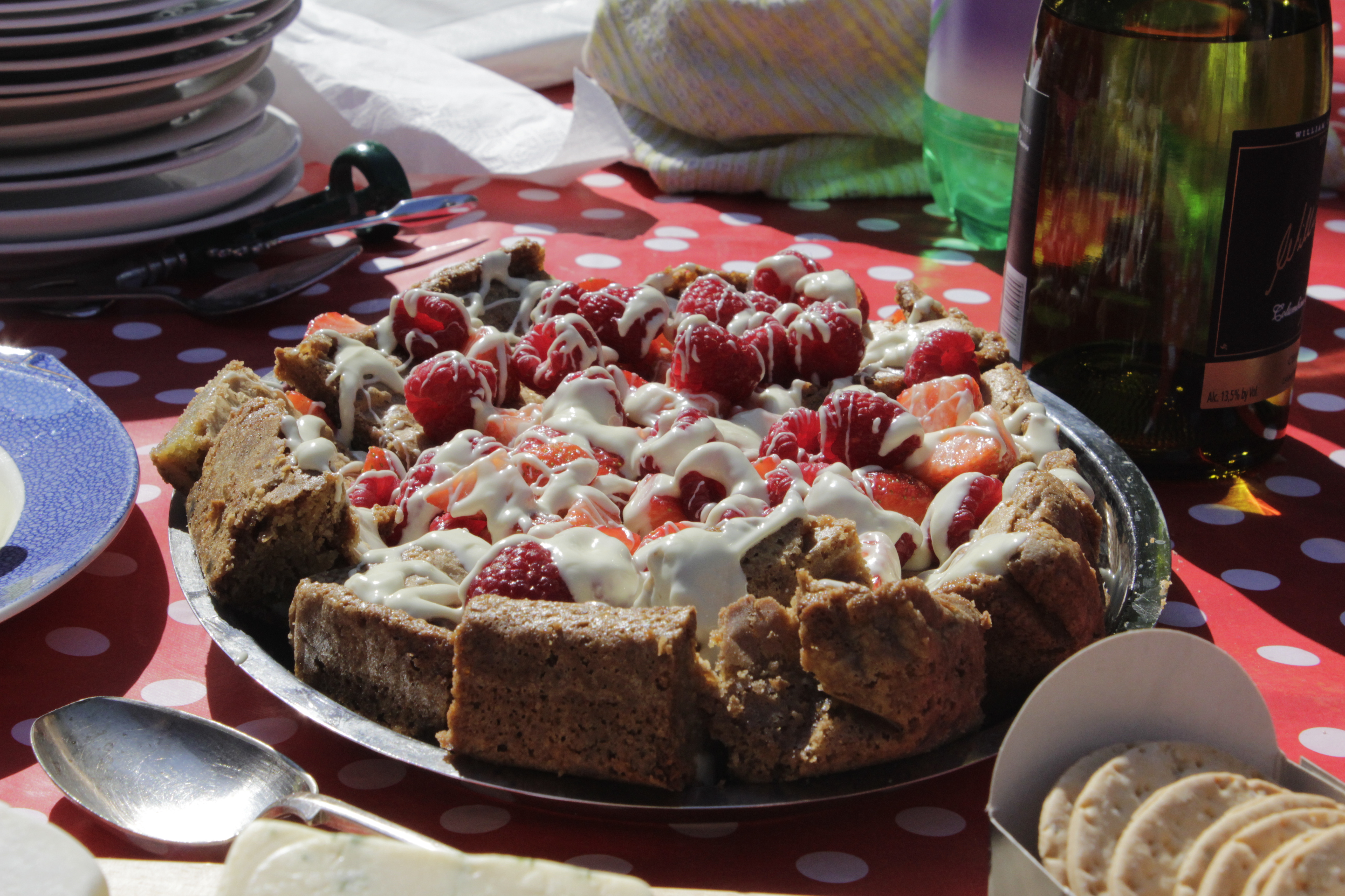 For those with a sweet tooth, we bring to you the seriously good ‘Blondie’. Its a Brownie really but is made with vanilla and white chocolate so has a very different taste and colour. We dressed ours with melted white chocolate and fresh rasberries and strawberries.