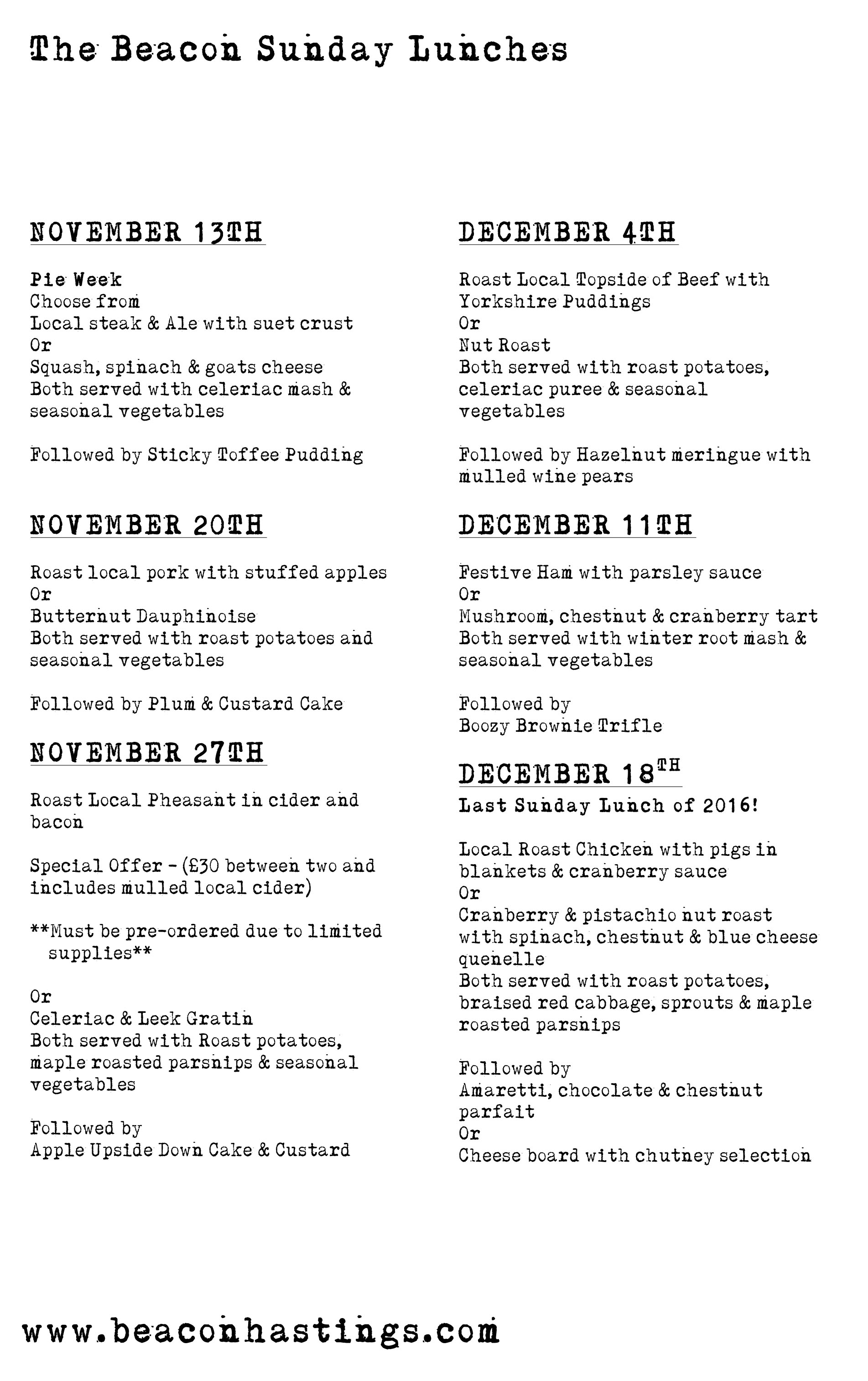 If you’ve yet to book your ticket to this years NYE celebration, please do so now! Spaces are limited and tickets include entrance, several sessions of live music with a top local band, food all evening and champagne at midnight. We’ll have a mulled wine lodge in the garden and plenty of cheer to see you through to the new year – info@beaconhastings.com