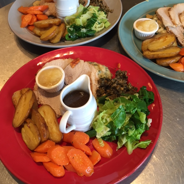 From midday onwards we’ll be offering a locally sourced pork with home made apple sauce or our own vegetarian or vegan Nut Roast, each served with roasties, seasonal vegetables and gravy.