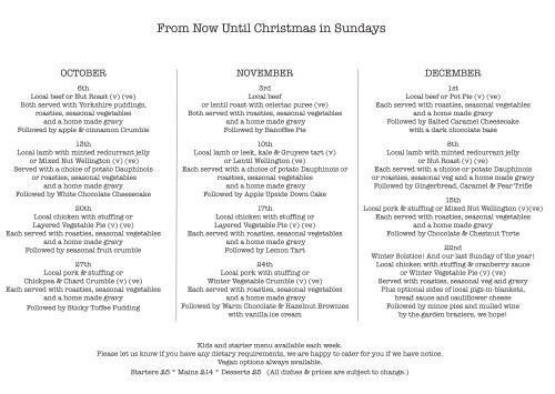 This week is a local roast lamb with minted redcurrant sauce or mixed nut Wellington (v) (ve). Both served with a choice of potato Dauphinois or roasties, seasonal vegetables and a home made gravy.