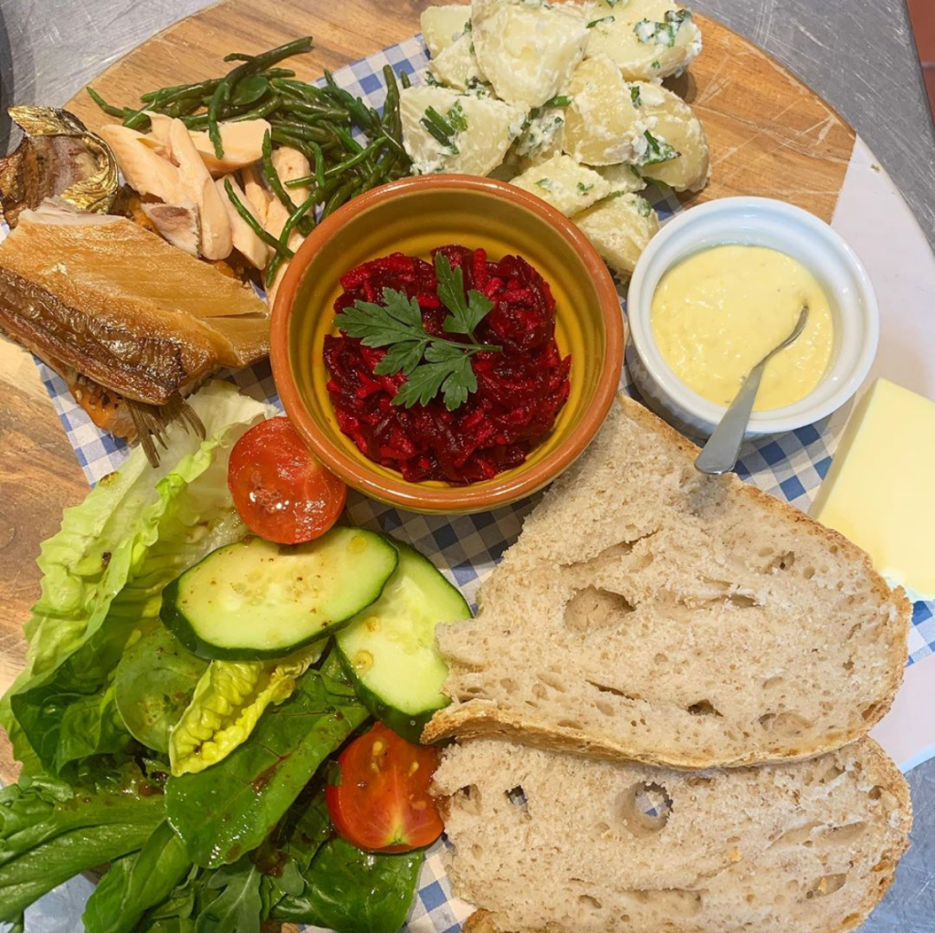 Smoked fish, samphire, beetroot & apple relish, horseradish mayo or mature cheddar & onion tart, garlic & fresh herb cream cheese, chutney, pickled onion. Each comes with potato salad, mixed leaves & house sourdough.