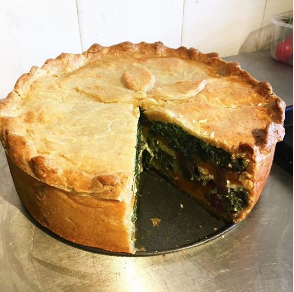 - Layered vegetable pie; butternut squash, woodland pearl barley (with herbs, chestnuts & mushrooms) & creamy spinach ricotta all layered in a polenta pastry crust (V)