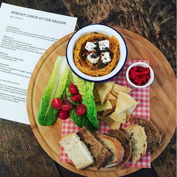 Starter £7.50 – chickpea & roasted red pepper dip, feta, crudité selection & house sourdough. (vegan without feta)