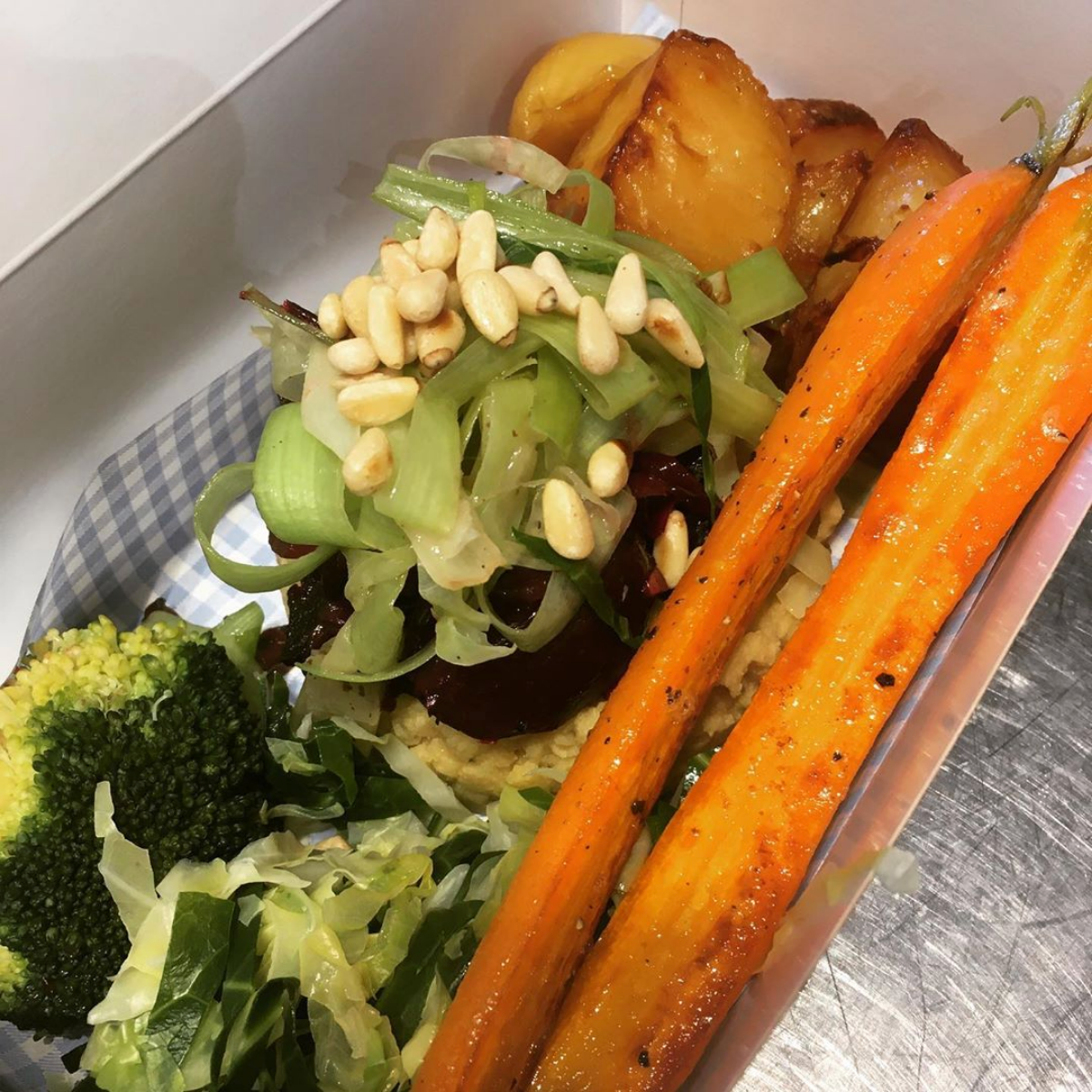 • “Beacon Beets Tower”: balsamic roasted beetroot & red onion, sizzled leeks & pine nuts all piled high atop a bed of chickpea mash (ve)