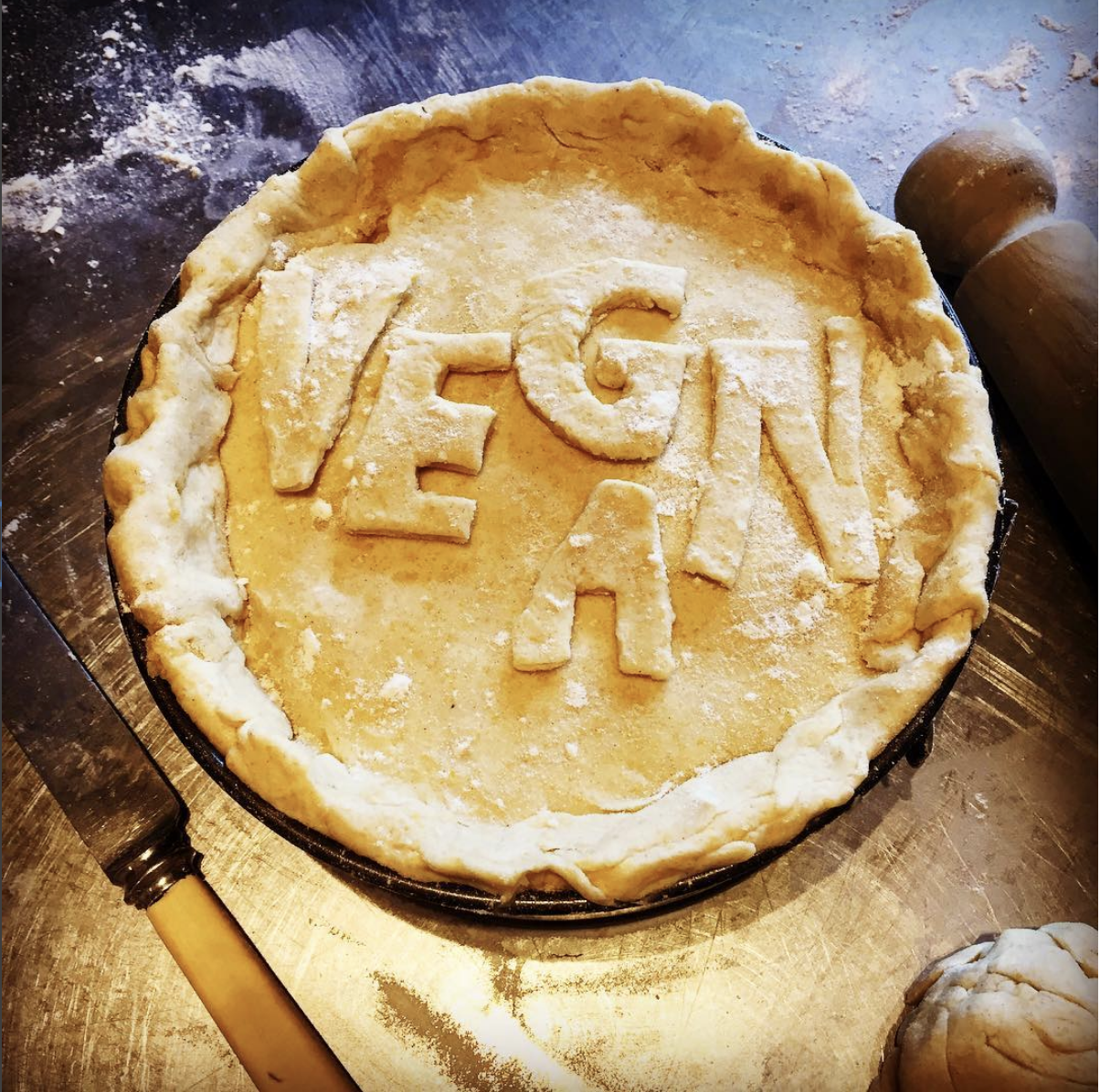 Homity Pie – wholemeal crust deep filled with creamy leeks, homegrown spinach, mature cheddar & potato with a cheesy topping (v)