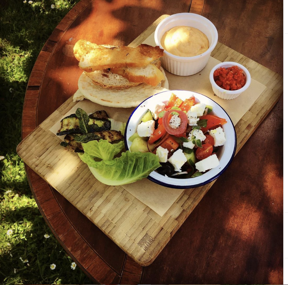 - Spanakopita – spinach, feta & fresh herbs in a Filo pastry (vegetarian & vegan options available), roasted red pepper houmous, heritage tomato salad, squashed roast garlic potatoes