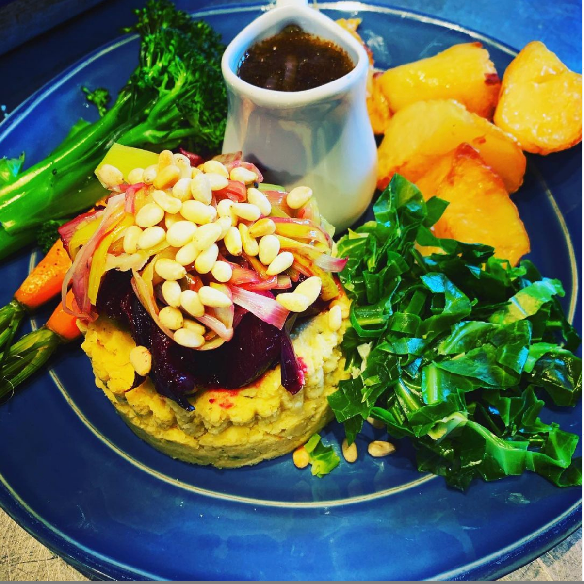 - Beacon Beets Tower; Balsamic roast beetroot & red onion, sizzled leeks & pine nuts all piled on top of a bed of chickpea mash (ve)
