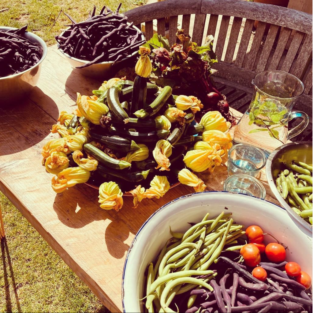 Also, seasonal platters; courgette fritters with fresh pesto or home cured salmon with smoked mackerel pate and brown shrimp. Each served alongside a grazing board of homegrown salads, potatoes, fresh greens and freshly baked bread.
