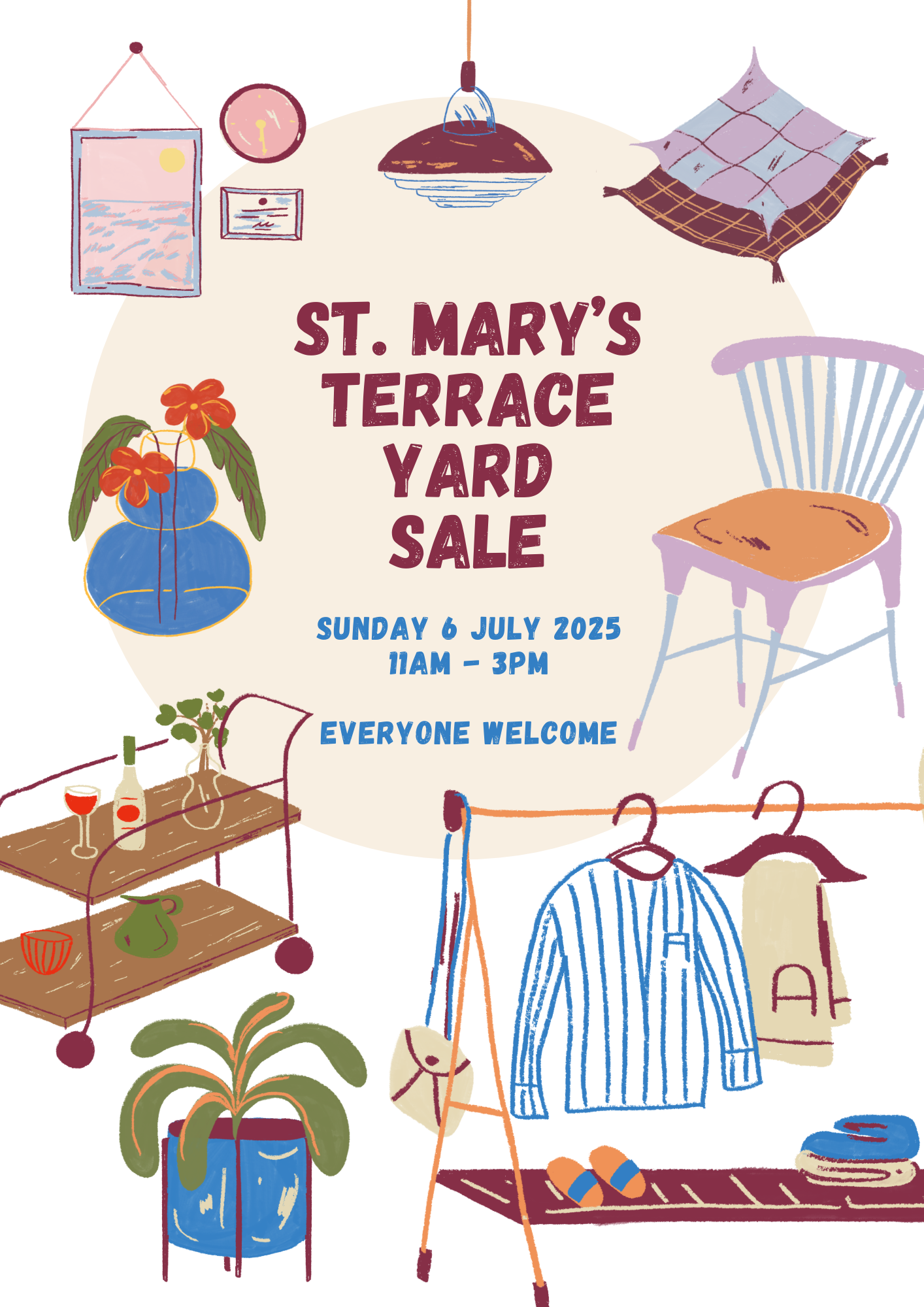 There’s to be a Yard Sale in our very own St Marys Terrace, we’ll be here with tea/coffee available in the morning, plus a table of our own treasures for sale…
