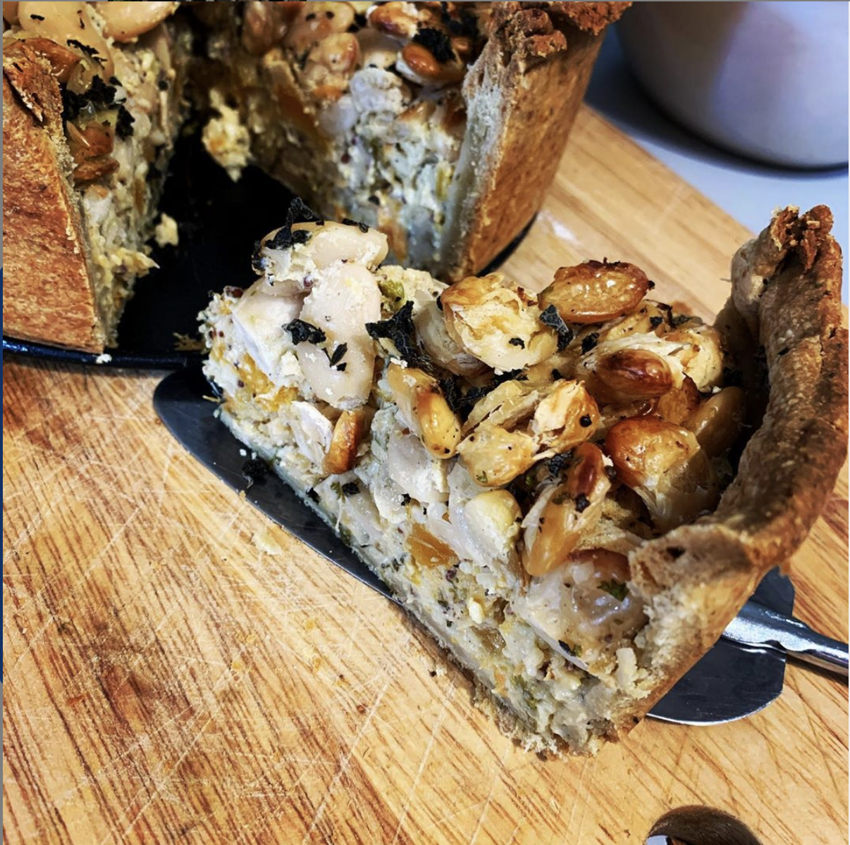 Squash, winter herb & crispy butterbean pie – garlic roast squash in a creme fraiche, Lancashire cheese & herb sauce topped with crispy beans in a cheese pastry (v)