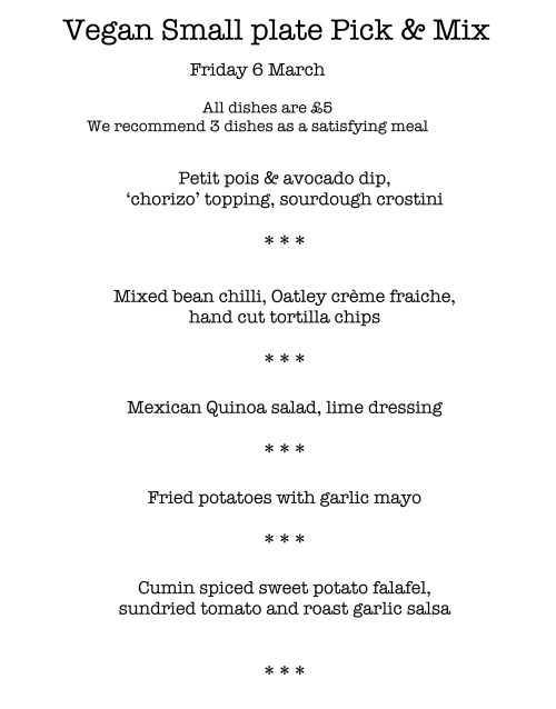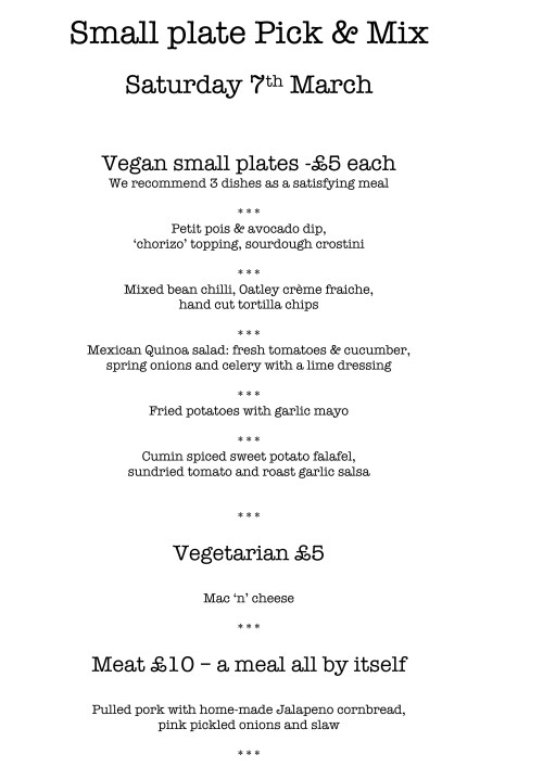 Bar & kitchen open from 6, we will be serving a menu of (vegan) small plates until 8.30.
